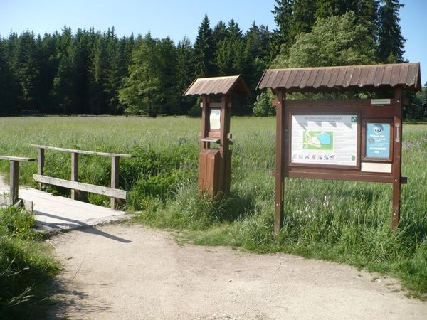 Jedná se o zpřístupněné části přírodní rezervace stejného názvu (lesní vrchovištní rašeliniště). Stezka je v provozu od července 1976. 5,4 km od Mariánských Lázní, vstup z parkoviště u silnice (160 metrů za lesní restaurací Nimrod). Dostupnost po silnici z Mariánských Lázní (směrem na Prameny), nebo po značených turistických cestách (modrá, červená značka). Z parkoviště přístup po lesní pěšině (67 m), vlastní vstup na naučnou stezku a celá trasa na vyvýšeném dřevěném můstkovém chodníku. Celková délka vlastní naučné stezky 76 metrů. Na trase jsou dvě vyhlídkové plošiny (výhled na mofetový štít - bahenní sopky a na vývěr plynů v Zeleném jezírku).